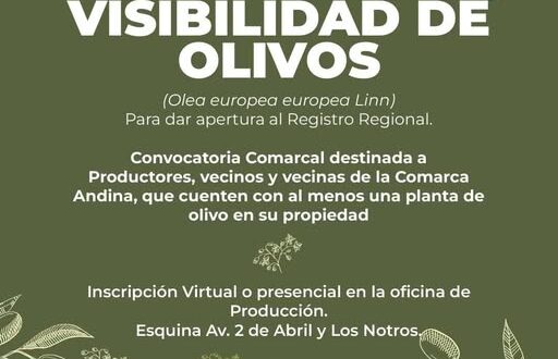 La Dirección de Producción de la Municipalidad de Lago Puelo, en articulación con instituciones y áreas productivas de la Comarca Andina, convoca a productores y vecinos que cuenten con plantas de olivo en su propiedad a participar de la Encuesta de Visibilidad de Olivos (Olea europaea europaea Linn.) – Comarca Andina.