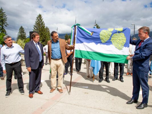 En este contexto, se presentó oficialmente por primera vez la Bandera de la Ciudad de El Bolsón, creada en el marco del Centenario como expresión de identidad, memoria colectiva y proyección futura de la comunidad. El diseño fue seleccionado mediante concurso público, resultando ganadora la propuesta realizada por la vecina Cecilia Noemí Conar.