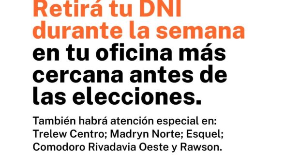 Con el objetivo de que todos los ciudadanos cuenten con su documento vigente antes de las elecciones de este domingo 26 de octubre, el Gobierno del Chubut, a través del Ministerio de Gobierno, recuerda que quienes hayan tramitado su DNI pueden retirarlo durante esta semana en las distintas delegaciones del Registro Civil de la provincia.