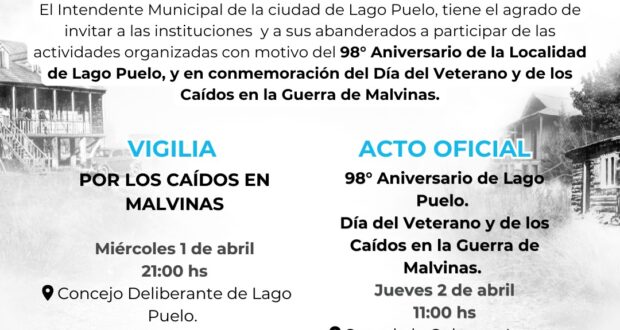 En el marco de las actividades conmemorativas por el 98° Aniversario de Lago Puelo y el Día del Veterano y de los Caídos en la Guerra de Malvinas, la Municipalidad de Lago Puelo propone una serie de actividades abiertas a toda la comunidad los días miércoles 1 y jueves 2 de abril.