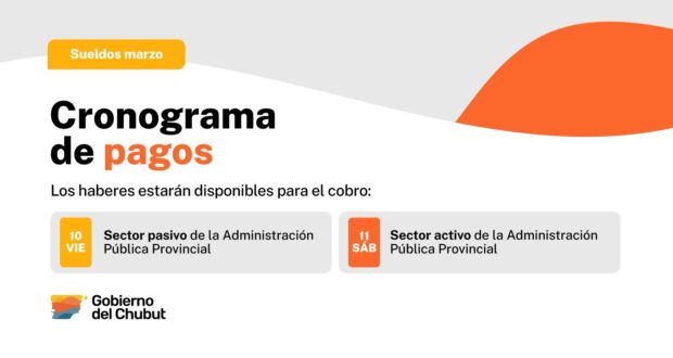 El Gobierno del Chubut informa que este jueves 9 de abril realizará el depósito correspondiente a los haberes del mes marzo a los agentes pasivos de la Administración Pública Provincial, en tanto el viernes 10 hará lo propio para los trabajadores en actividad.